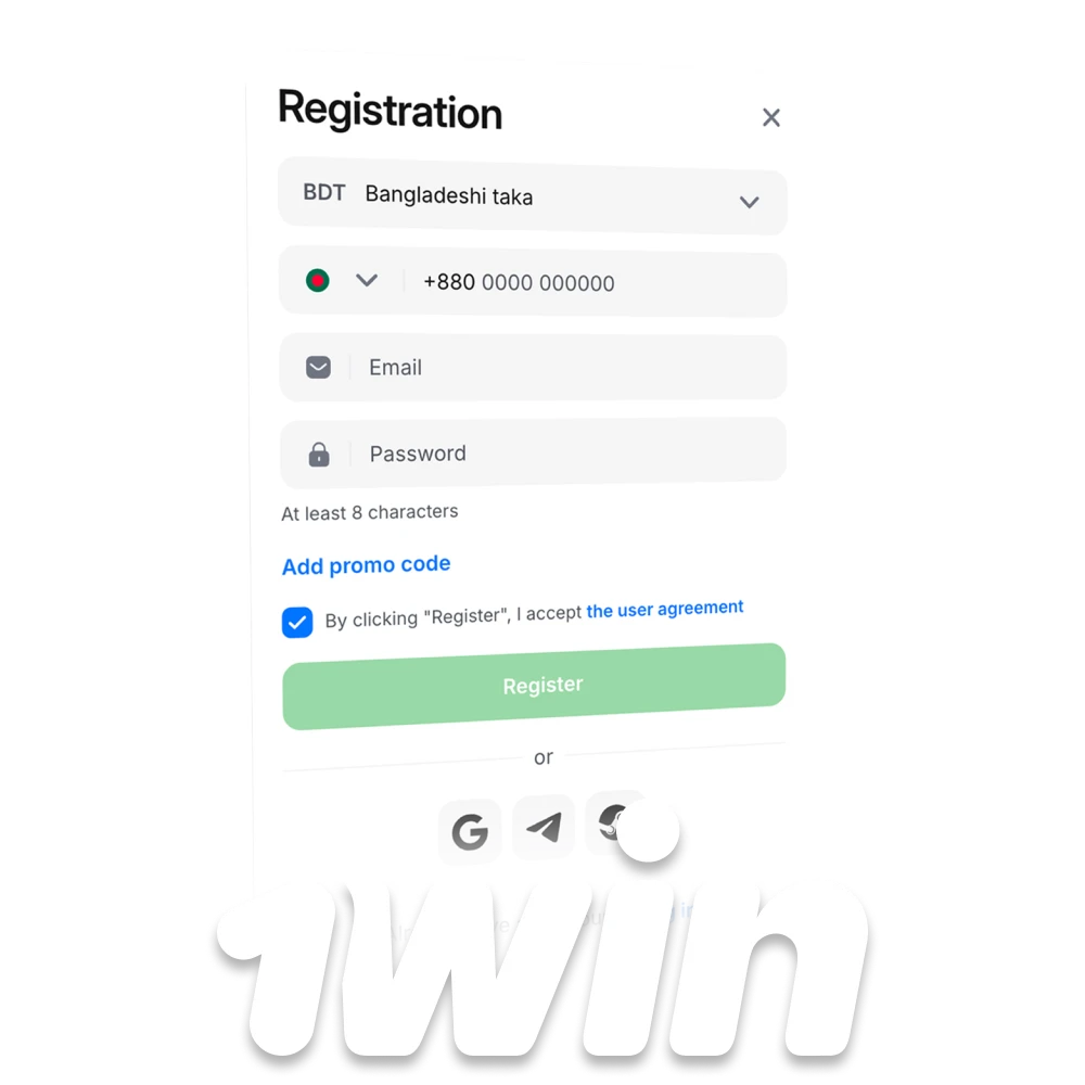 Click Register on this page → choose your method (phone, email, social, or one-click) → fill in your details → select BDT as currency → confirm. Under 2 minutes total.
